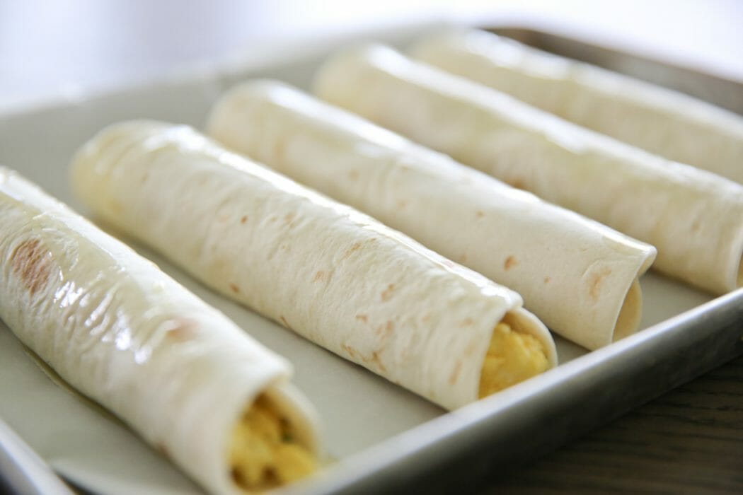 - Warm tortillas in microwave if needed to ease rolling process. Working with a few tortillas at a time, place a scant ¼ cup of egg mixture into the center of each one and roll up into a cylinder. Place rolled tortillas on prepared baking sheet, seam-side down, so they are not touching each other. When all tortillas are rolled and filled, lightly spray tops with cooking spray, or lightly brush with olive oil. Bake for 15 minutes or until edges are golden brown and crisp.