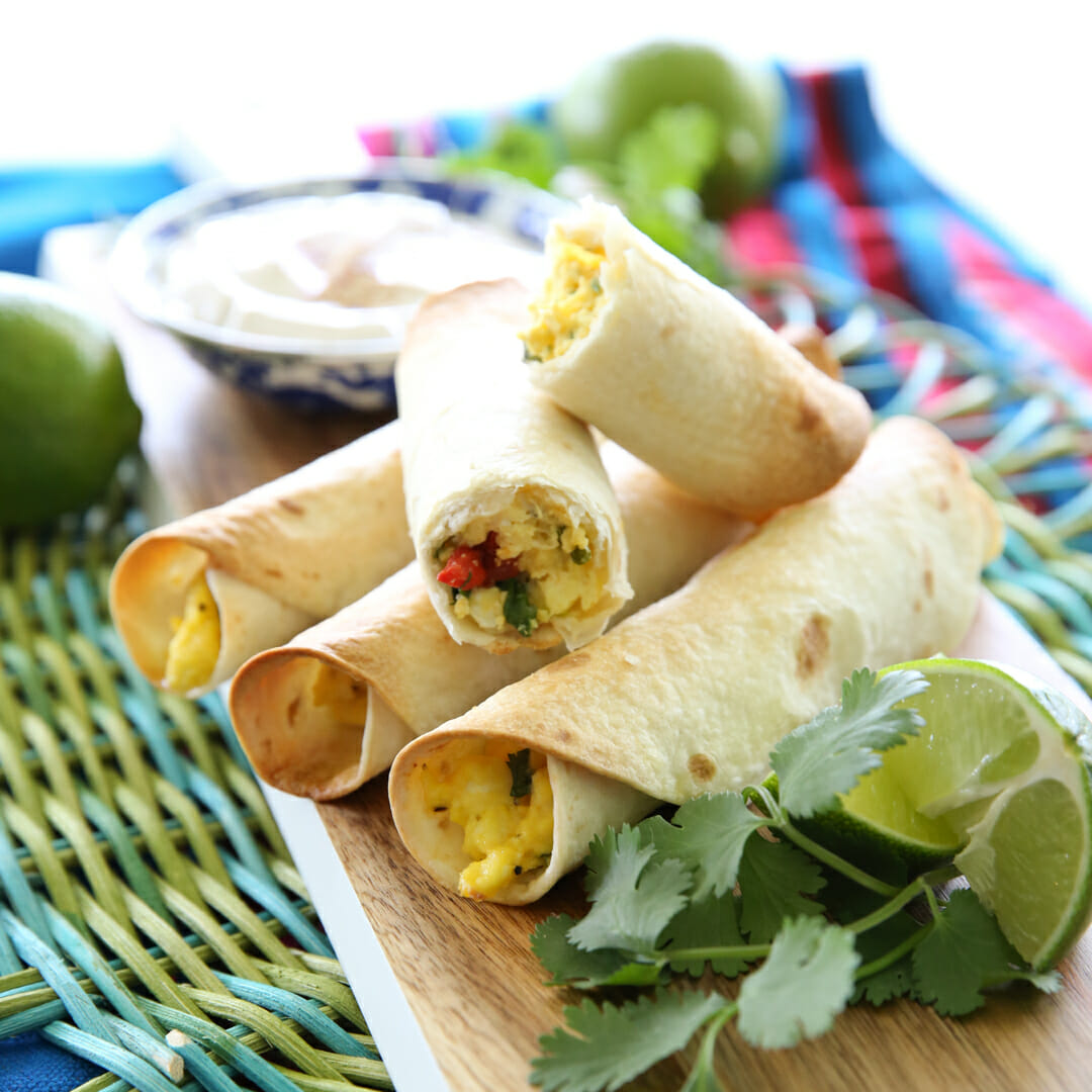Our Baked Creamy Chicken Taquitos are arguably one of the most popular recipes on this site. Years ago, I set out to make a breakfast version (in my never-ending quest to invent ways to eat Latin food for every meal of the day) and these Baked Breakfast Taquitos were born. They’re filled with a flavorful cheesy egg mixture and dipped in the most amazing chipotle lime sauce. You guys. If you haven’t made this recipe before, you need to! Not only is it a great breakfast recipe, but it’s a fun dinner or brunch as well. And you can prep them ahead of time and bake them up hot when it’s meal time.