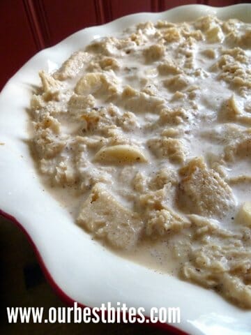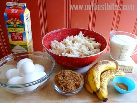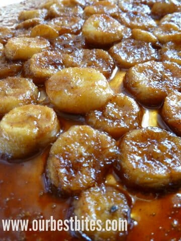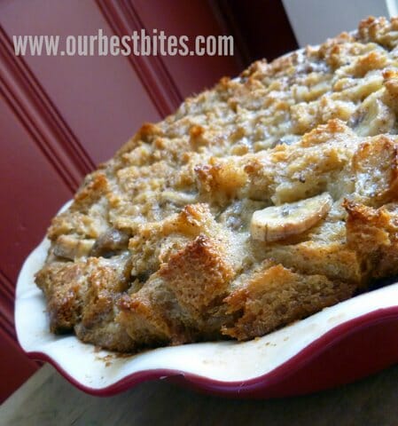 While the bananas are caramelizing, use an electric hand mixer to combine the milk, whipping cream, egg yolks, eggs, vanilla, salt, remaining brown sugar, rum flavoring (if using), and remaining cinnamon. Spray a 9×13″ dish with non-stick cooking spray and spread 1/2 of the bread cubes over the bottom of the pan. Evenly spread the caramelized bananas and brown sugar mixture and then slice one more banana over the caramelized bananas. Spread the remaining bread cubes over the bananas. Whisk the egg mixture one last time and pour evenly over the bread cubes. Allow to stand for 10-15 minutes (longer if possible), poking the bread down into the mixture so it can soak in the milk and eggs. Bake for 40-50 minutes or until puffed and golden (but not brown) and a knife inserted into the center comes out clean. Serve with Crème Anglaise (with 1/4 tsp. ground cinnamon added), Buttermilk Syrup, or vanilla ice cream.