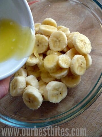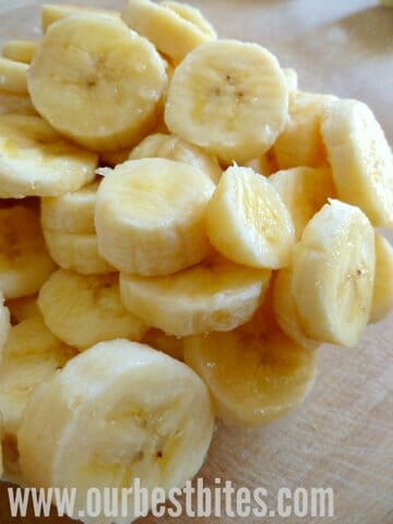 Cut up about 3 very ripe bananas (you’ll want 2 cups of sliced bananas). Place them in a small mixing bowl.