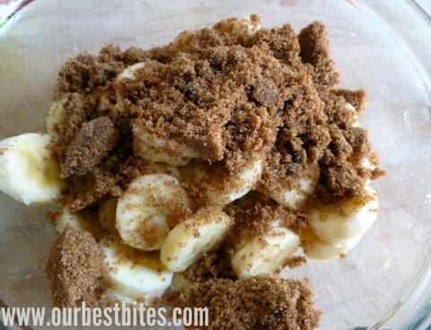 Preheat oven to 400. Line a rimmed baking sheet with heavy-duty foil. In a small mixing bowl, combine 3 sliced bananas (about 2 c.) with 1 Tbsp. melted butter. Combine 1/4 c. brown sugar and 1/4 tsp. cinnamon and then add them to the bananas and butter. Gently toss to combine and spread on the prepared baking sheet. Bake for 15 minutes or until the bananas are fragrant and tender and the sugar is starting to bubble and caramelize. Remove from oven and reduce heat to 350.