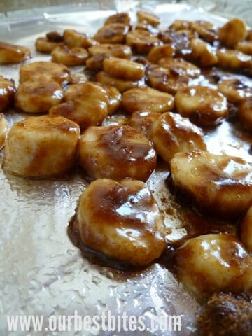 Seriously, can you go wrong with bananas, brown sugar, and cinnamon? Spread the bananas onto the prepared baking sheet