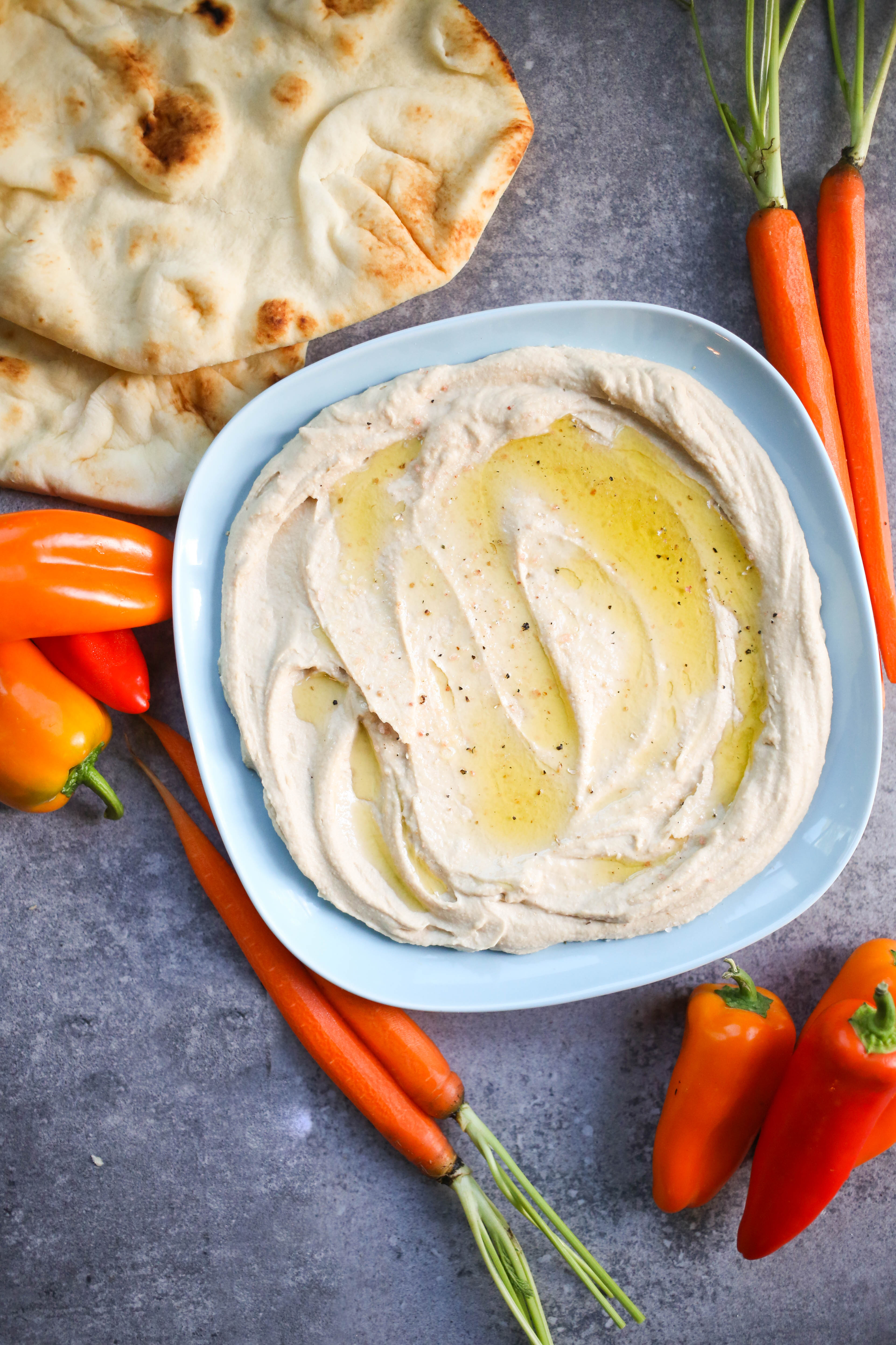 - To serve, spread a layer onto a plate or shallow bowl and drizzle with a good quality olive oil and, if desired, additional garnishes (like chopped olives, roasted red peppers, chopped parsley, toasted pine nuts, etc.). Serve with warm flatbread or pita, your favorite veggies, pretzel or pita chips.