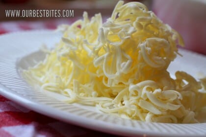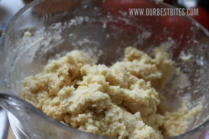 - Then take your cold butter and a cheese grater and grate that sucker. Look how pretty! Gently fold the butter into the flour mixture so it is light and crumbly.