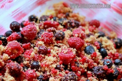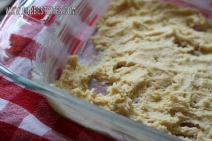 - Now, take some berries, toss with brown sugar, and spread the berries over the “crust.” Drop the remaining dough over the berries and set aside.