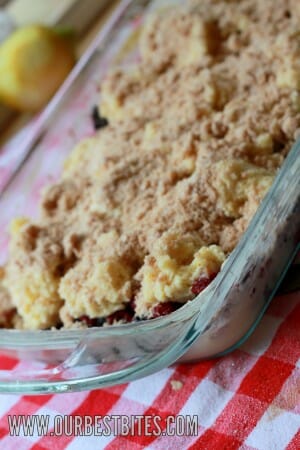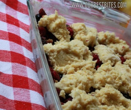 - Now…I’m using the streusel topping from our blueberry muffins, so if you like that, then I’m willing to bet my cat you’ll like it here, too! Mix together some sugar, a bit of flour, and cinnamon. Cut in a few tablespoons of butter until the mixture is crumbly. Sprinkle it over the dough-topped berries and then pop the whole pan into the oven. Bake it for 45-55 minutes or until the topping is golden brown and the dough is cooked through.