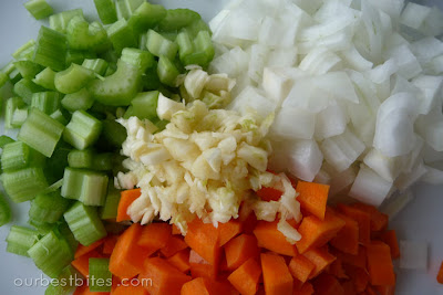 • Place a large stock pot on the stove-top and set to medium-high heat.  When pan is warm, add olive oil.  Add carrots, celery, onion, and garlic and sauté 4-5 minutes.