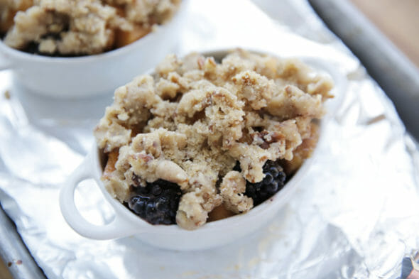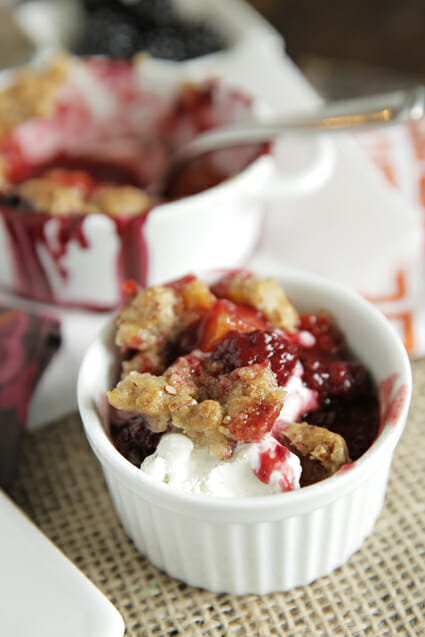 The combination of flavors with both the peaches and the blackberries is so amazing here, and this topping is craaaazy good. This is one of my most favorite summer dishes. Make a little mini batch today and share it with someone special!