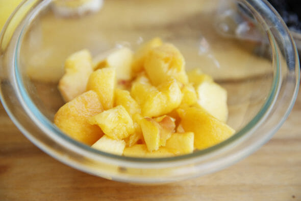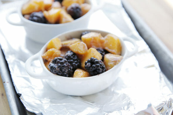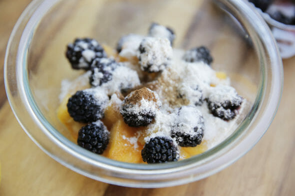 - Dice up a couple of ripe peaches, then toss in about 3/4 cup blackberries. It’s not a big deal to be exact here; crisps are very forgiving. You honestly can’t mess this up. Toss in a little sugar and a little flour, which will help thicken the juices. I also like to add a dash of cinnamon and ginger. Sometimes lemon zest if I have some. Toss that all together and pile them in ramekins, or similar size baking dishes.