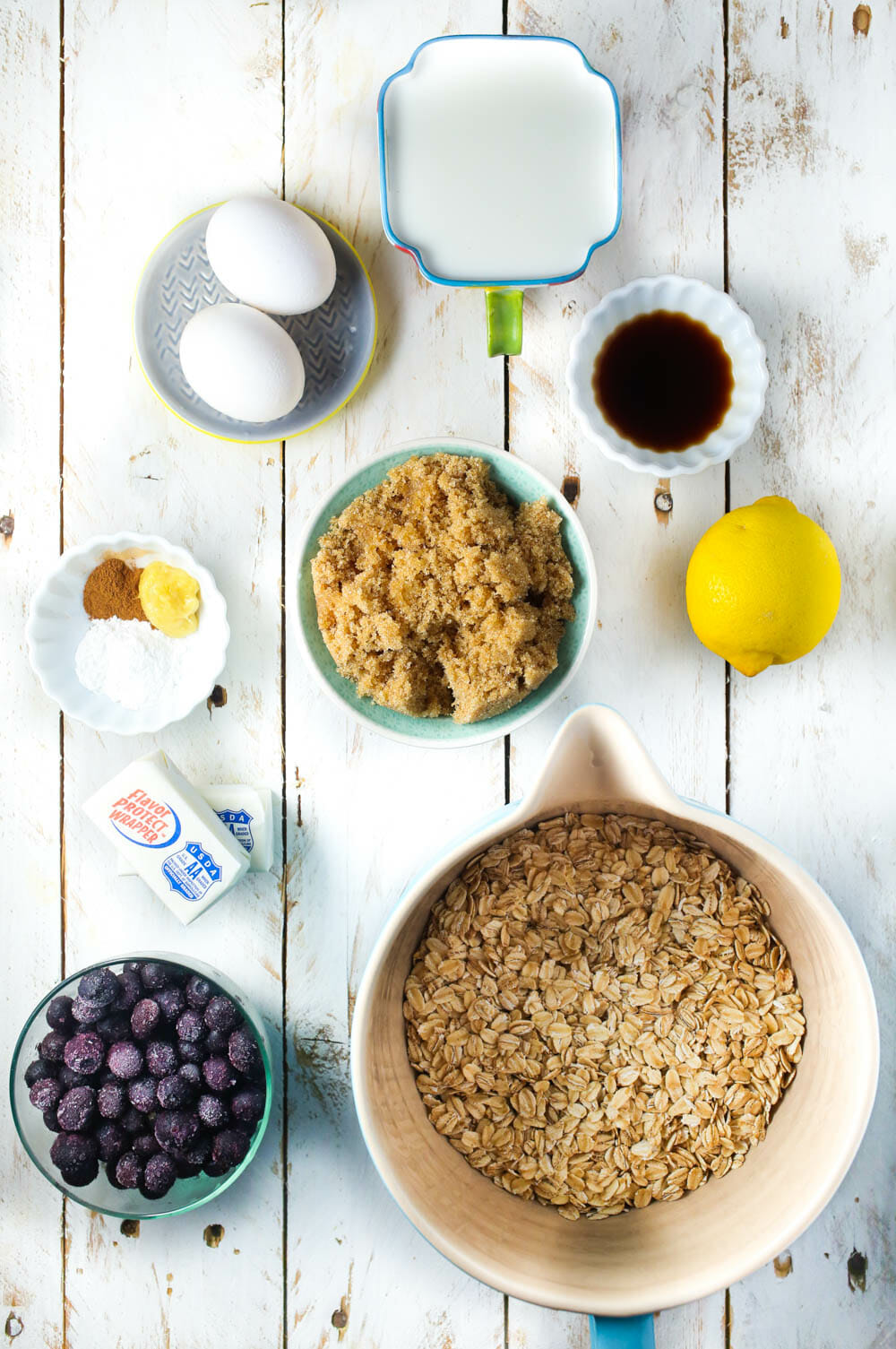 You’ll need rolled oats (not quick or instant), blueberries (fresh or frozen), the zest from 1 lemon, milk, eggs, vanilla, brown sugar, butter, baking powder, cinnamon, and ginger (fresh or dry–ginger is a unique spice where you use the same amount regardless of whether you’re using dry or fresh ginger).