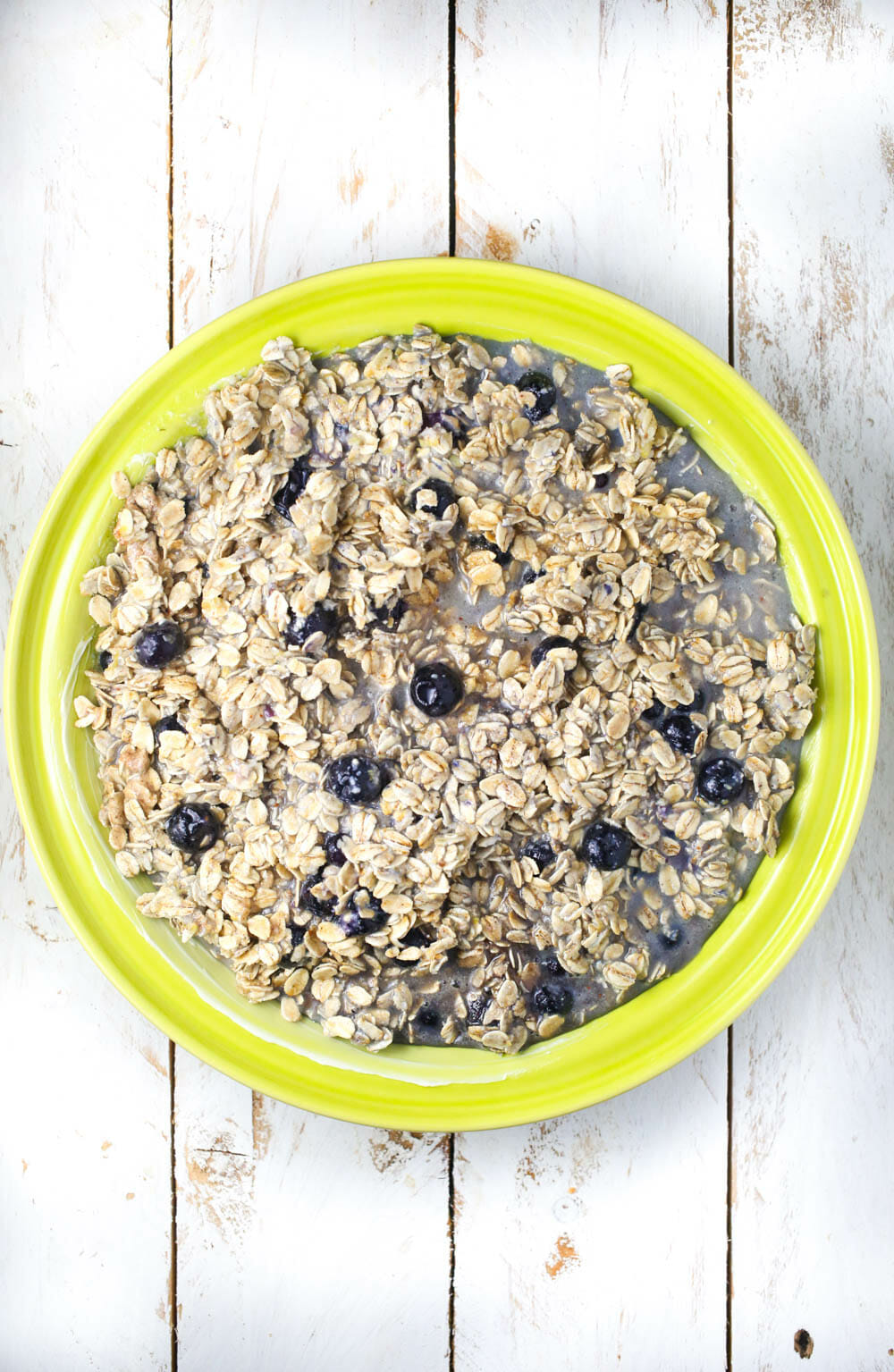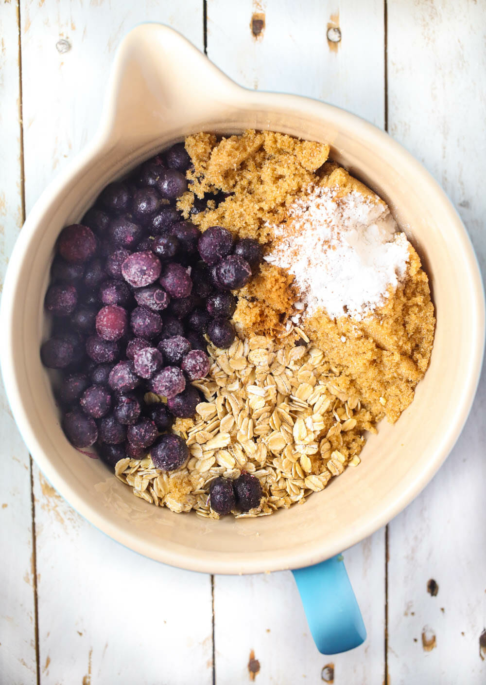 In a large bowl, combine the oats, brown sugar, cinnamon, ginger baking powder, salt, and blueberries.