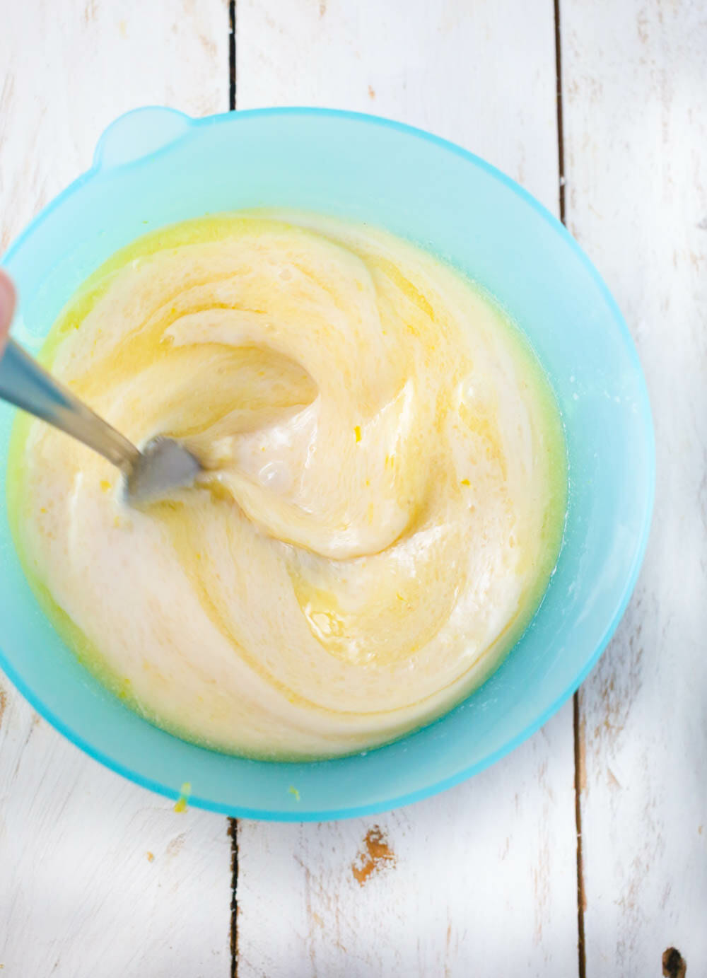 In a smaller bowl, whisk together the milk, butter, vanilla, eggs, and lemon zest.