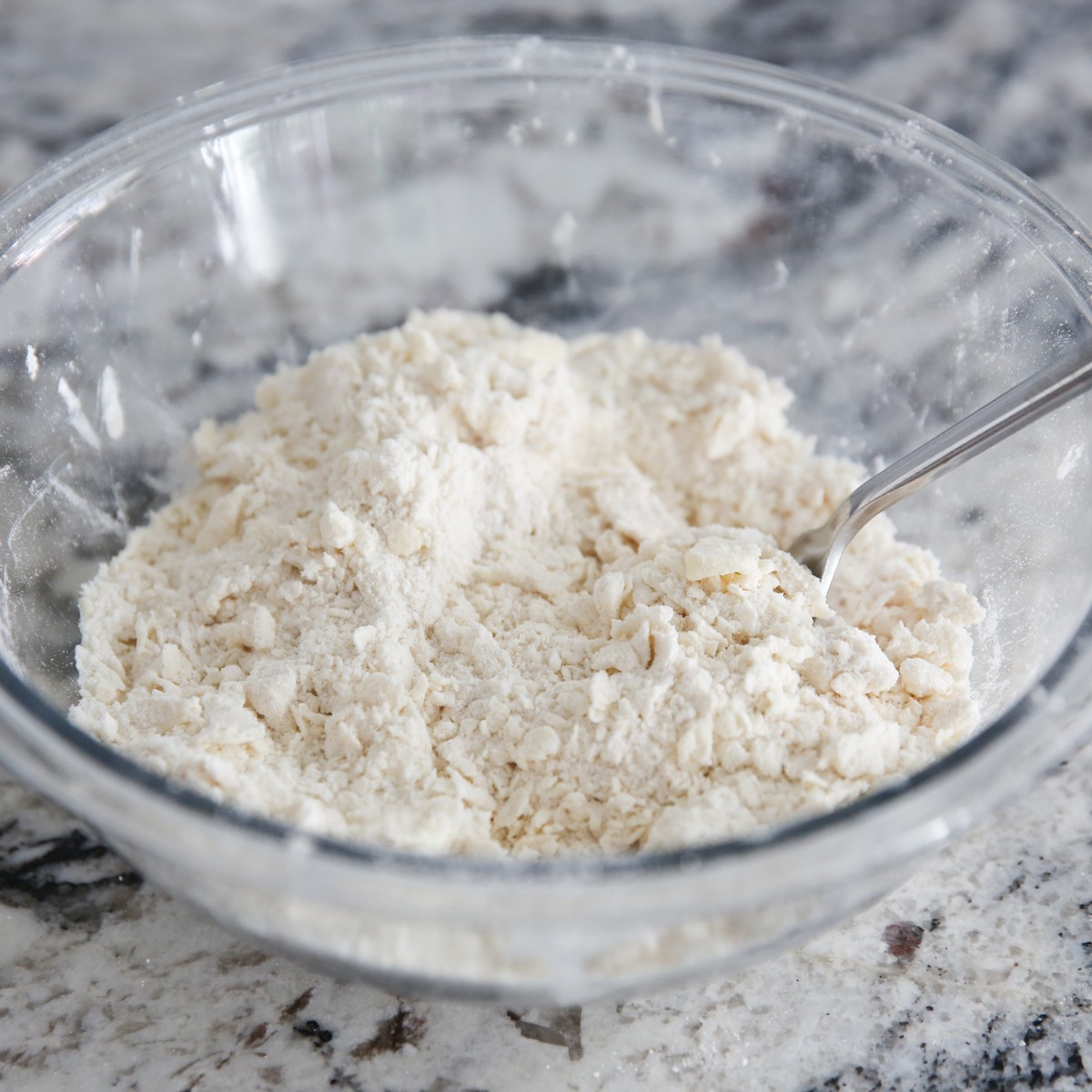 - First you’ll prepare the crust and topping. Combine sugar, flour, salt, and baking powder. Use a cheese grater to grate some cold butter into the flour mixture (or cut butter into small pieces and add to the flour mixture). Use your hands to break up the butter and flour mixture until it resembles course crumbs.