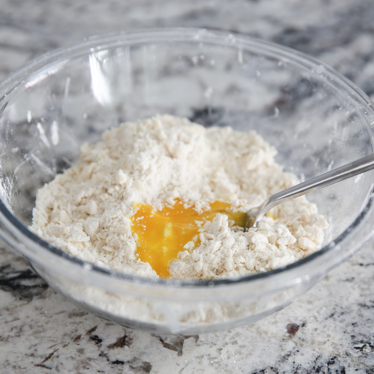 - Use a large-hole cheese grater to grate butter into flour mixture, or alternately cut butter into small chunks and add to flour mixture. Use clean hands to break up butter and flour mixture until it resembles large crumbs. Add egg yolk from separated egg (reserve egg white for the next step) and add to crumb mixture. Toss to incorporate egg yolk into crumbs.