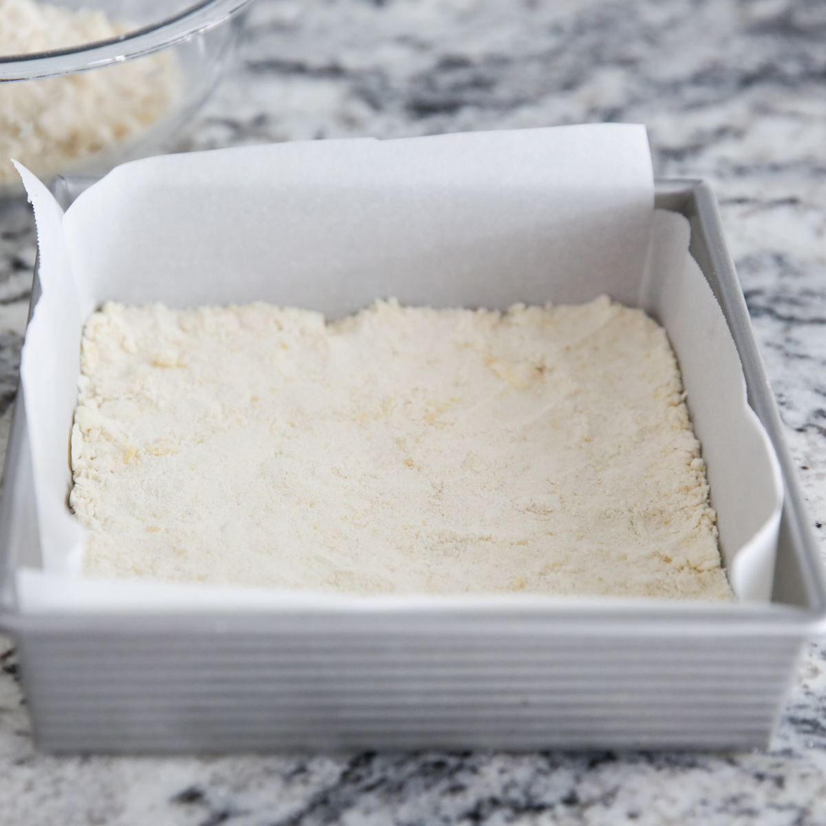 - Preheat oven to 350 degrees. Line an 8×8 baking dish with parchment paper or foil and set aside.