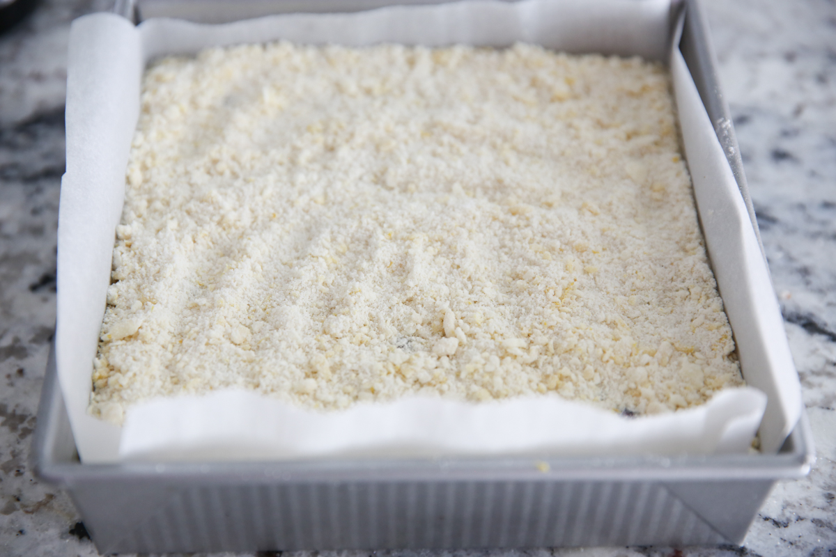 - Toss 3/4 cup berries with 1 1/2 teaspoon flour and sprinkle over the top of filling and then top with the reserved crumb mixture. Bake for 40-50 minutes. Bars should be just golden on top and slightly jiggly in center when shaken. Remove and let cool completely. Cover, and Place in fridge overnight to chill (or at least 8 hours). When ready to serve, slice into bars and serve with sauce if desired.