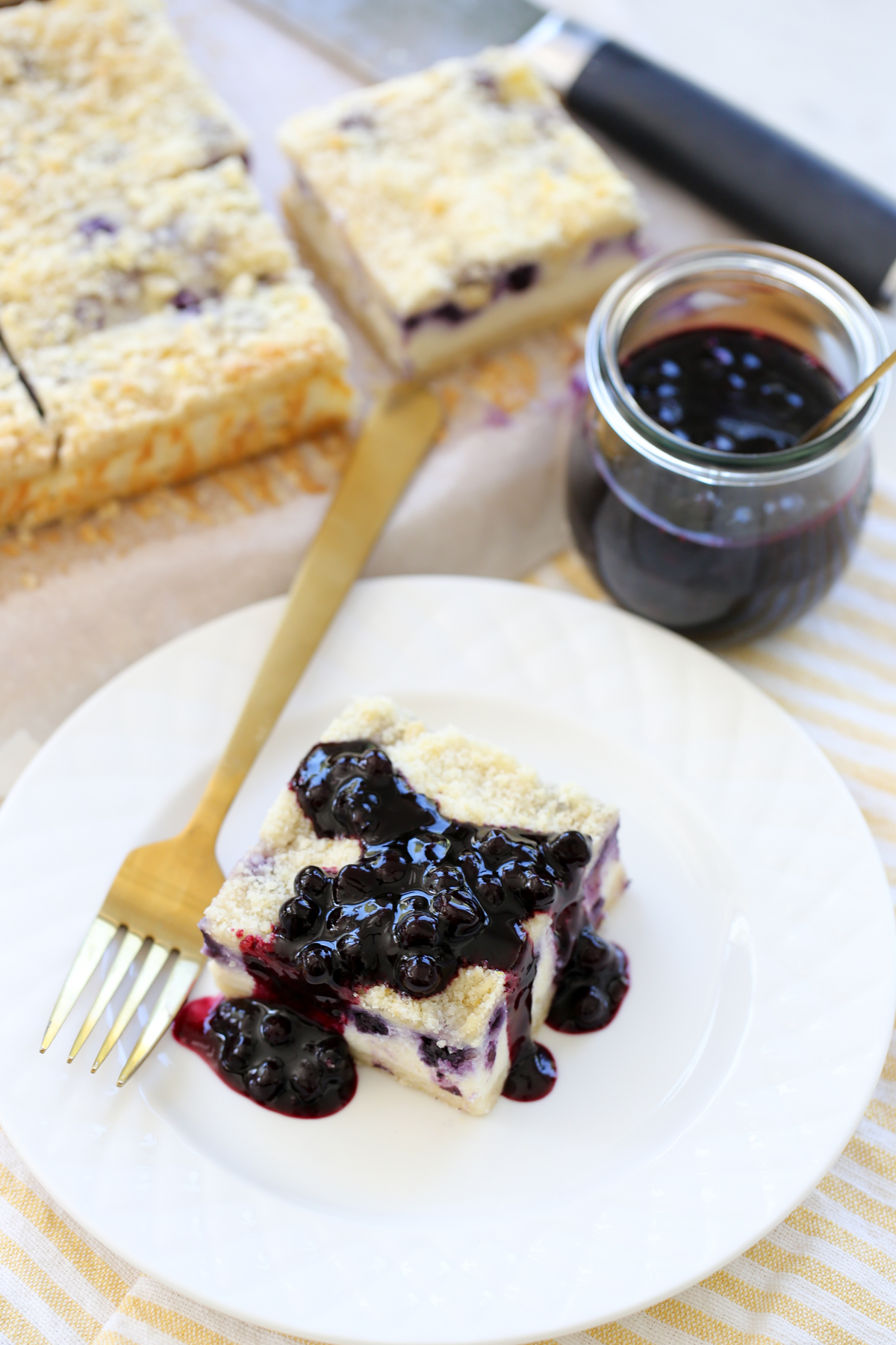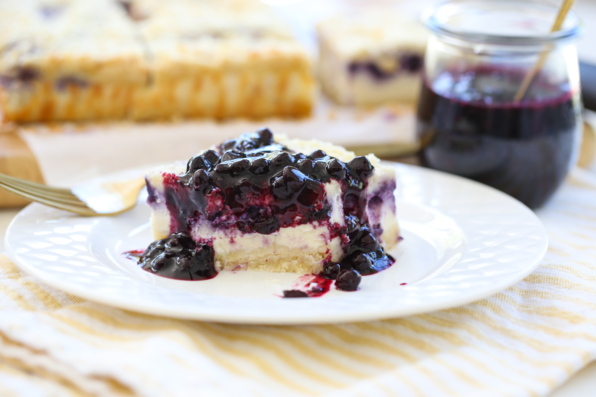 These Blueberry-Lemon Ricotta Cheesecake Bars are creamy and dreamy with a bright fresh combo of lemon and blueberries. While traditional cheesecake is made with cream cheese, the ricotta mellows the flavor and cuts the tang just a bit. While they’re still incredibly dense and creamy, they feel a little lighter than a traditional cheesecake to me. These have a delicious shortbread crust and a lemon crumble topping that is out of this world. They can be served on a plate with berry sauce and eaten with a fork, or served bar style without the sauce and just picked up with your hands. Either way they’re perfection!