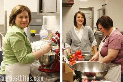 We got right to work and started prepping food for 120 people! We couldn’t have done it without lots of help, like Cindy (L) who made tons and tons of chocolate mousse, and Leigh and Michelle (R), who chopped their hearts out. Well Michelle chopped her heart out. Leigh, what were you doing? 😉