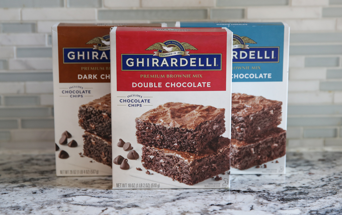 - Ghirardelli Boxed Brownie Mix (Pictured below) – I prefer this brand because I think it’s the best boxed brownie. It’s also the one I use and test in this recipe so I know it works! Boxed brownie mixes are not created equal and require different baking times, etc. If you use a different mix (especially one meant for a larger pan) you’ll just want to be aware that baking time may vary.