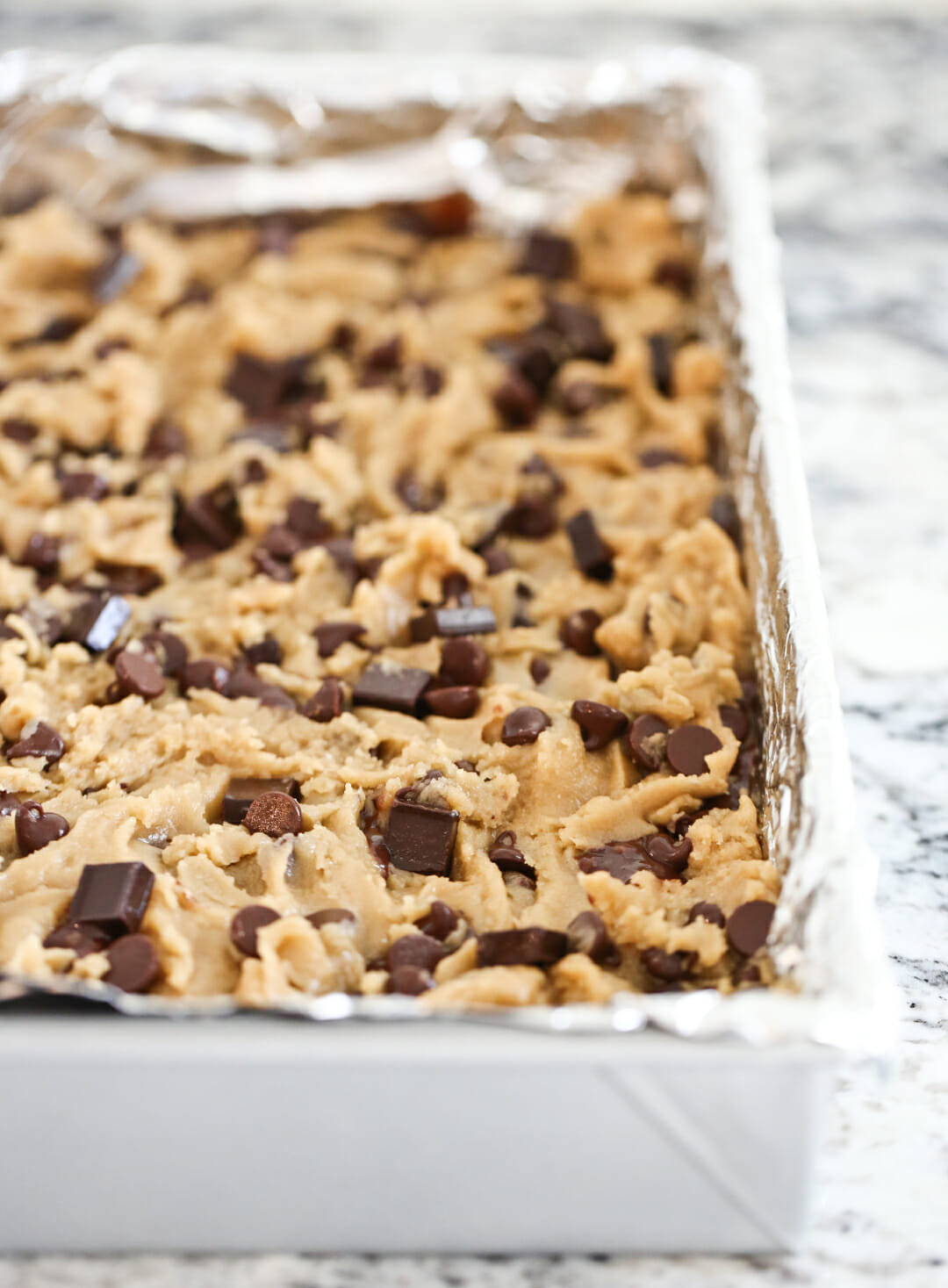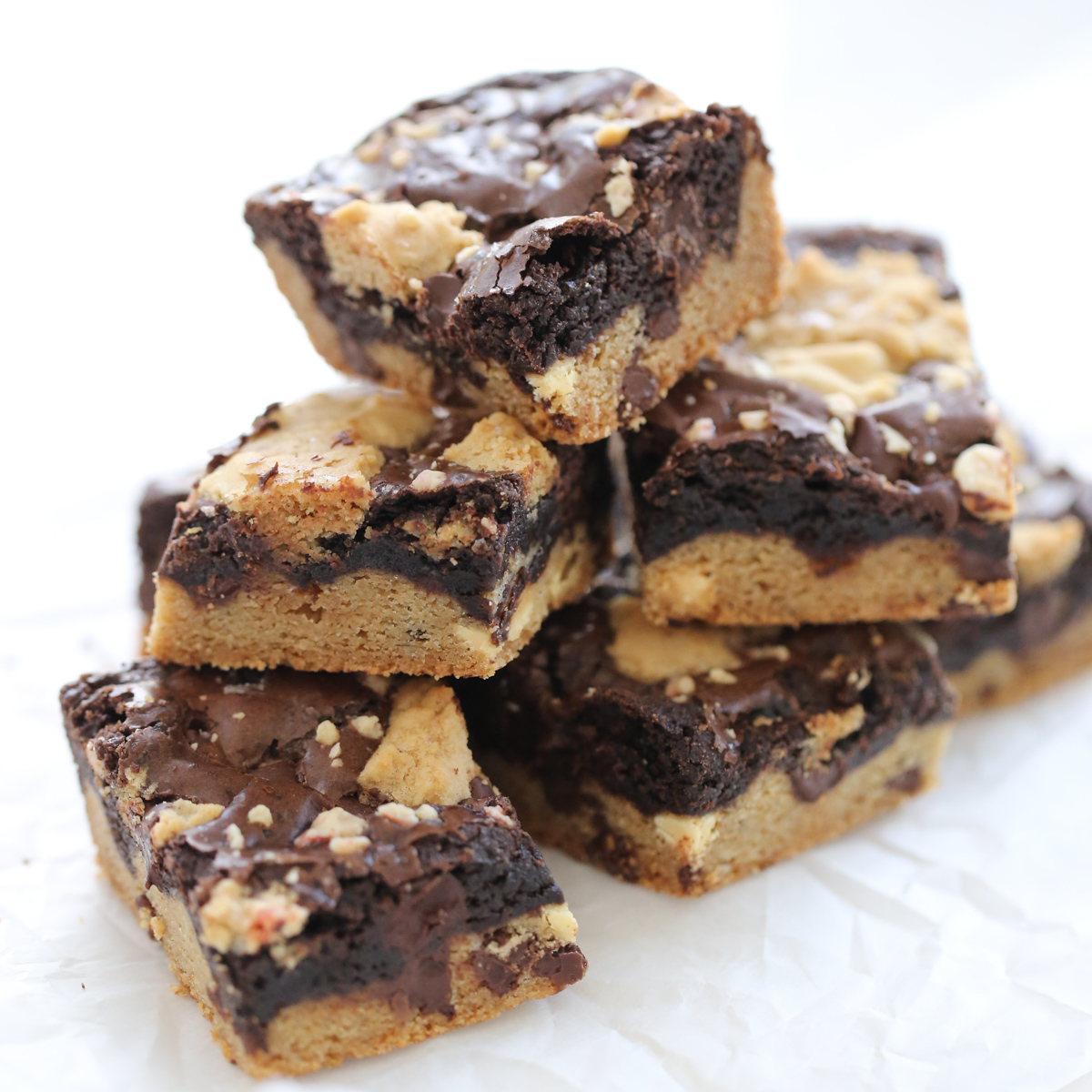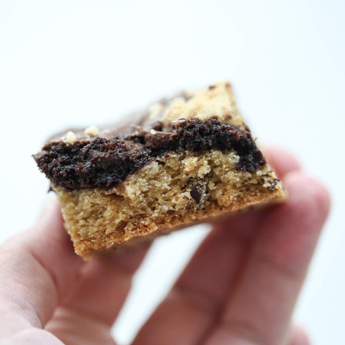 I’ve experimented with this because logically it seems like the cookie being the sturdier dough should be on bottom! It does work, but I found I had to cook them much longer, resulting in a bar that wasn’t quite as moist and chewy. I also really like the craggy tops of the original. But if you’re using a brownie that’s incredibly soft and worried about it holding up to your cookie dough, feel free to swap layers! Here’s a couple of photos of my experimenting (I saved a bit of cookie dough to sprinkle on top as well)