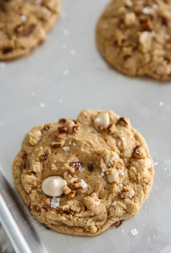 Browned butter first timer here – I can’t believe what a difference in flavor it makes! These were divine! (I may have overmeasured the flour, though, because the dough was kind of crumbly/wouldn’t hold its shape very well – so just be aware of that, future cookie makers.) I grabbed the kroger brand caramel chips and I thought they tasted great (though I didn’t compare them to anything else, so take that for what it’s worth). Also, I didn’t have any sea salt for the top, so I just skipped it and the cookies still tasted delicious, just not as fancy.