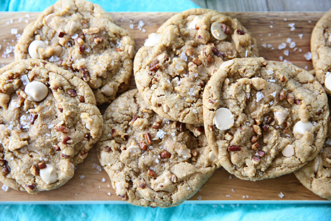 If you can’t find those caramel chips, you could make this recipe with any chips you like. They’d be good with white chocolate, butterscotch, cinnamon chips, or chocolate! - Chopped pecans, toasted – If you are an “ew, nuts in cookies” person, I’m telling you- chop them fine and TOAST them and it’s a total game-changer. I like my nuts chopped pretty fine, but it’s a personal preference. You can buy them pre-chopped at the grocery store. Just place them in a dry skillet (no oil in there or anything) and toss them around until they are golden brown on the white parts of the nuts. They’ll smell divine. Make sure to let them cool down before you put them in your dough.