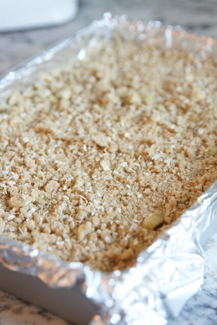 - Pop the whole thing in the oven and bake it until the cheesecake is set, the apples are soft and caramelized, and the topping is golden and crunchy. You can pour the caramel over the top of the whole pan at this point and let it just kind of set in there as they cool, or you can leave it off (see tips below). Either way works great.
