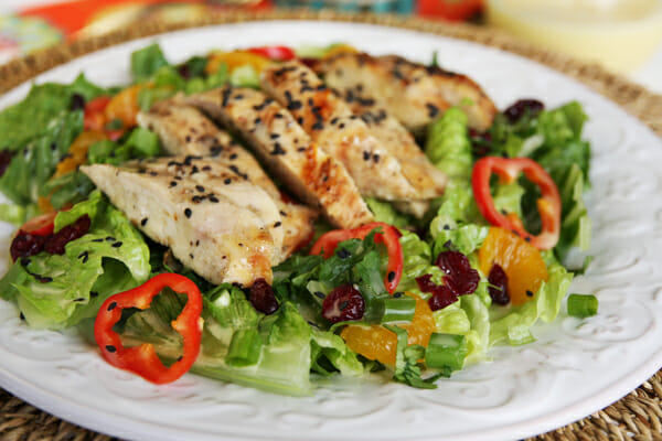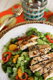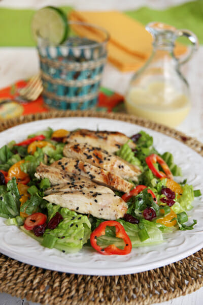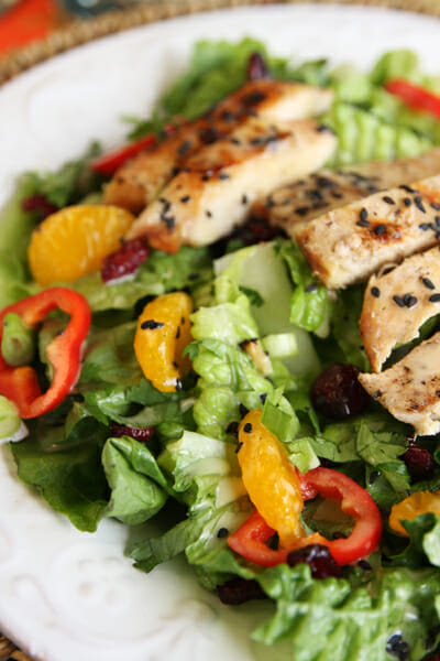 To prepare salads, divide lettuce between 4 plates, top with grilled chicken, mandarin oranges, bell pepper, green onions, cilantro, and dried cherries or cranberries. Drizzle with dressing and sprinkle with sesame seeds. Serves 4 main dish, or 6-8 sides.
