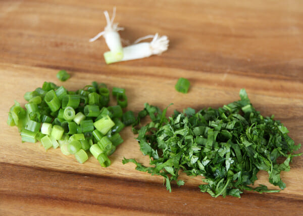 some bright herbs and greens, from green onions and cilantro (cilantro haters could use fresh parsley, and when you’re done go to the library and check out the book titled “Why I’m Missing Out in Life by Not Eating Cilantro”) 🙂