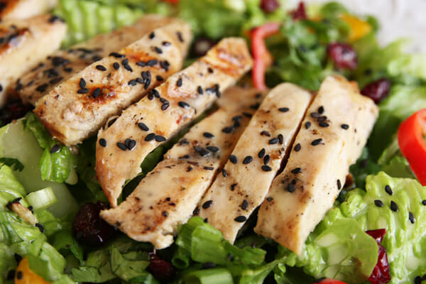 Put the salad all together by topping it with some grilled chicken.