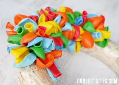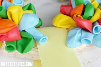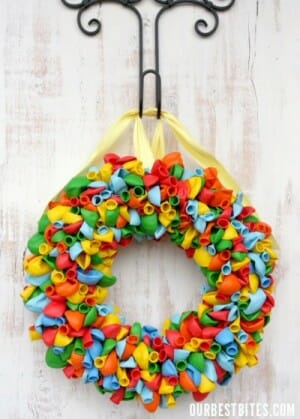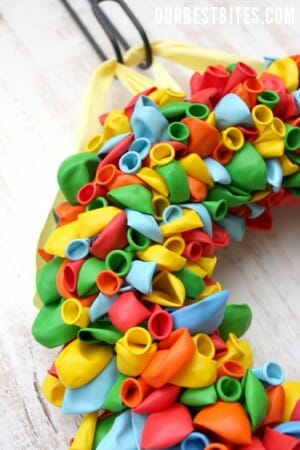 - Latex Balloons– lots of them. You can really stretch the amount you have, or you can really pack them in tight. I used about 275 Balloons. Remember, balloons are cheap, buy in bulk, try the party store or dollar store. I bought a bunch of mine at Walmart. I covered enough that you can’t see the wreath unless you get close up and look at the very side.