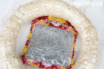 - Straw Wreath– the kind wrapped in plastic, they’re super cheap at craft stores. I think I paid $2 for a 14″ wreath. Foam or styrofoam could work also, but the straw works really well and it looks better if you don’t end up covering every last inch.