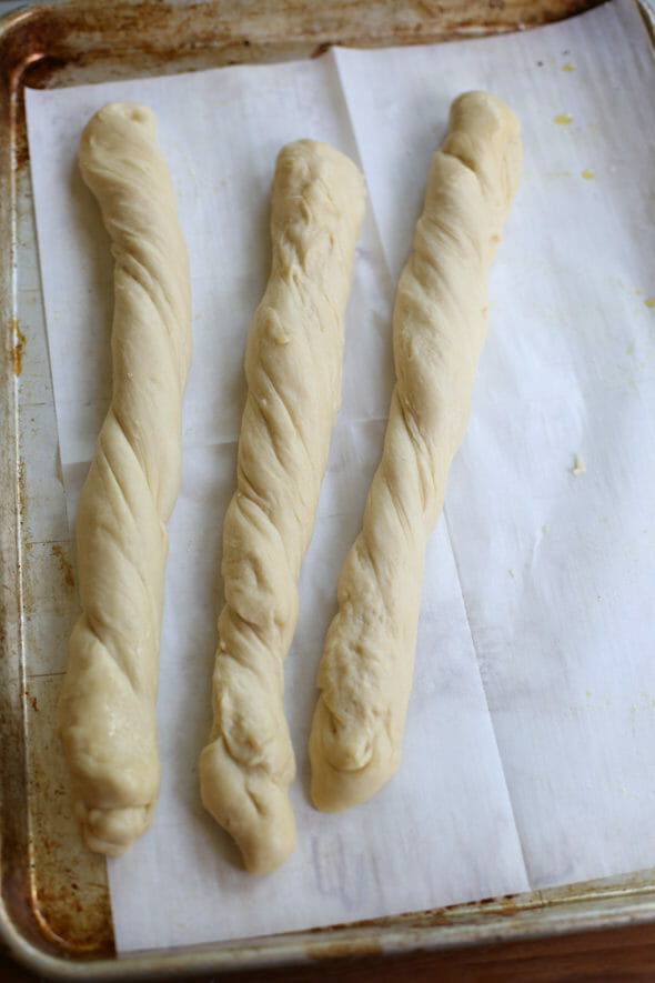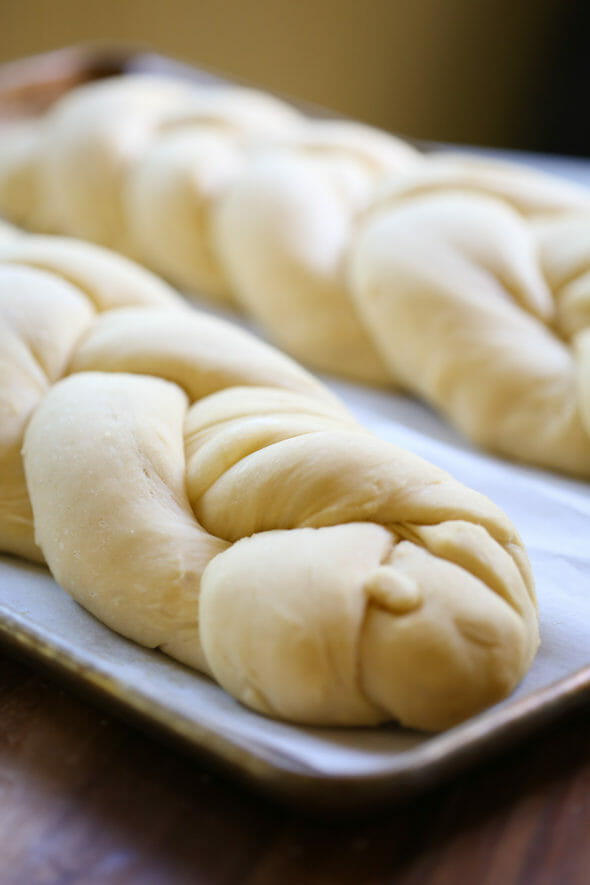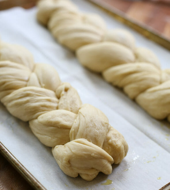 - Take one of the portions of dough and divide it into thirds. Roll/stretch it into a rope about 15-18 inches long and repeat with the remaining 2 pieces. Lay the three ropes next to each other and braid the dough, tucking the ends under the loaf. Place the braid on the prepared pan and repeat with the remaining dough portions (you’ll have 2 braids per pan).