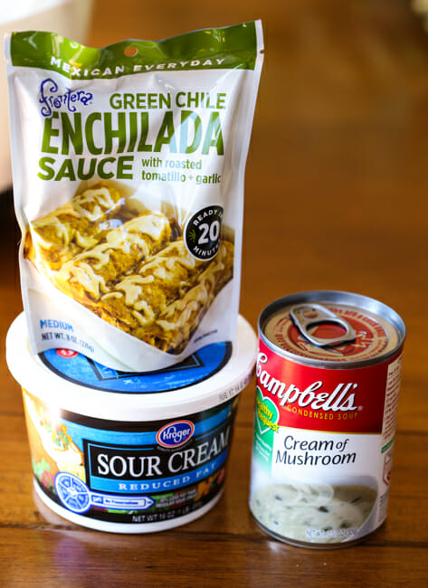 - In a small-ish mixing bowl, whisk together a can of cream of mushroom soup, sour cream, enchilada sauce, chiles, and green onions. Measure out 1 cup of the sauce and mix it with the egg mixture.