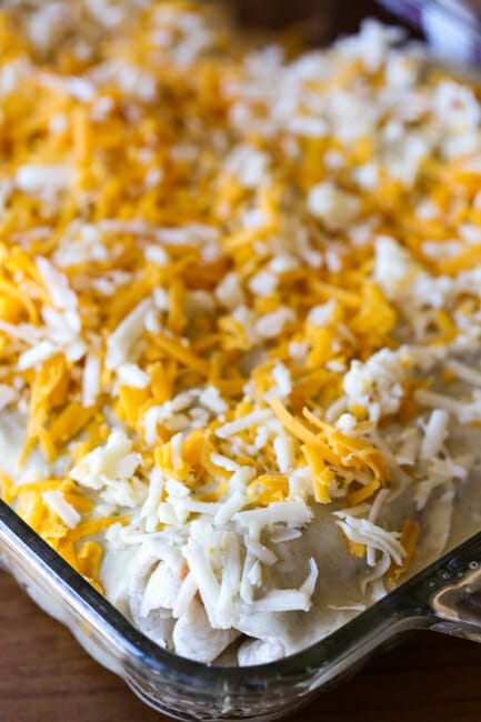 - Fill each tortilla with about 1 cup of the egg mixture and roll securely. Place in a 9×13″ pan. Pour the remaining sauce over the enchiladas and sprinkle with cheese (1/2 cheddar, 1/2 pepper Jack). Bake until the cheese is melted and the sauce is bubbly. Remove from oven and allow to stand for about 5-10 minutes before serving. Makes 8 servings.