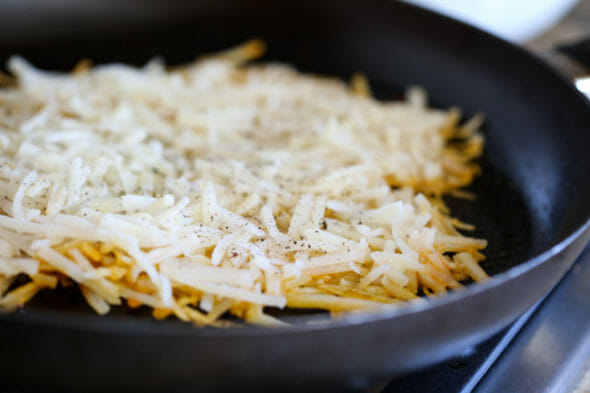 - In the same pan (and the same drippings), add 2 cups of shredded hash browns in a thin layer. Sprinkle with salt and pepper and cook for about 7 minutes or until brown and crispy, then flip and cook until the other side is brown and crispy. Remove from pan and add to the cooked sausage.
