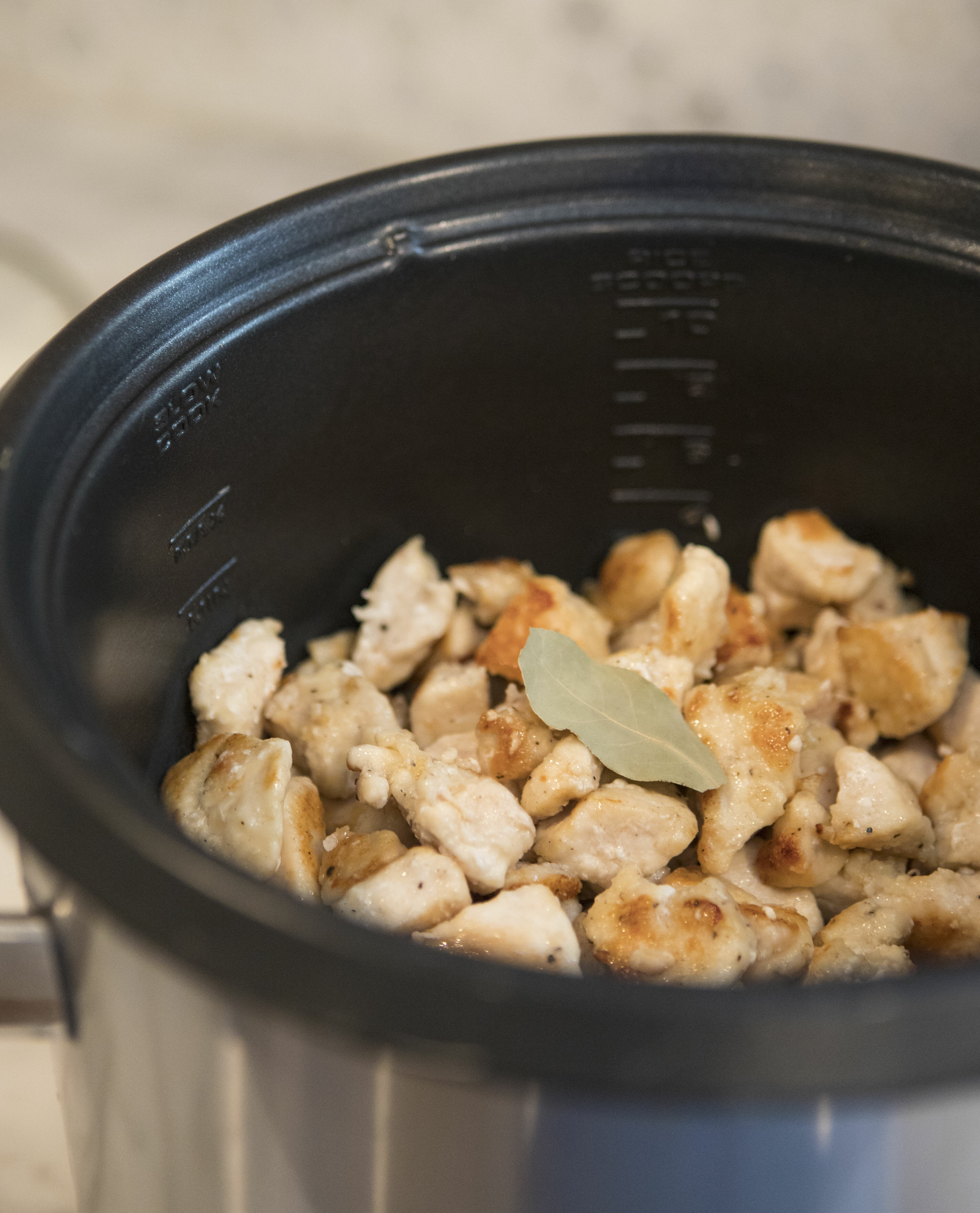 - While the chicken is draining, add wine, chicken broth, tomato paste, thyme, and marjoram to the onions and garlic in the blender. Blend until smooth. Place chicken and bay leaf in your slow cooker and then pour the sauce over the chicken. Place lid on slow cooker and cook on high for 3.5-4 hours.