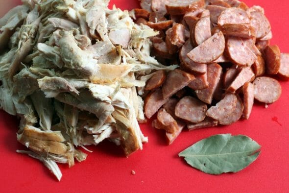 - Whisk in chicken broth and add bay leaf, sausage, and chicken.