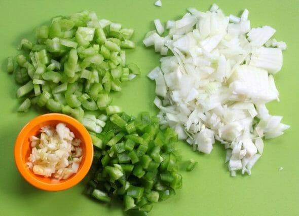 - Add onions, celery, and bell pepper; cook until softened, then stir in garlic.
