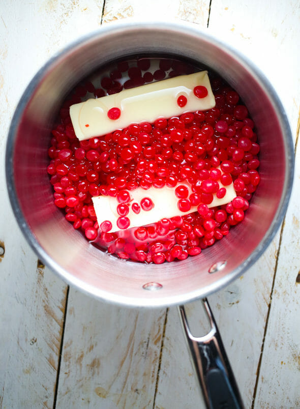 - In a saucepan, heat butter, Karo syrup, and Red Hots until boiling, stirring frequently.