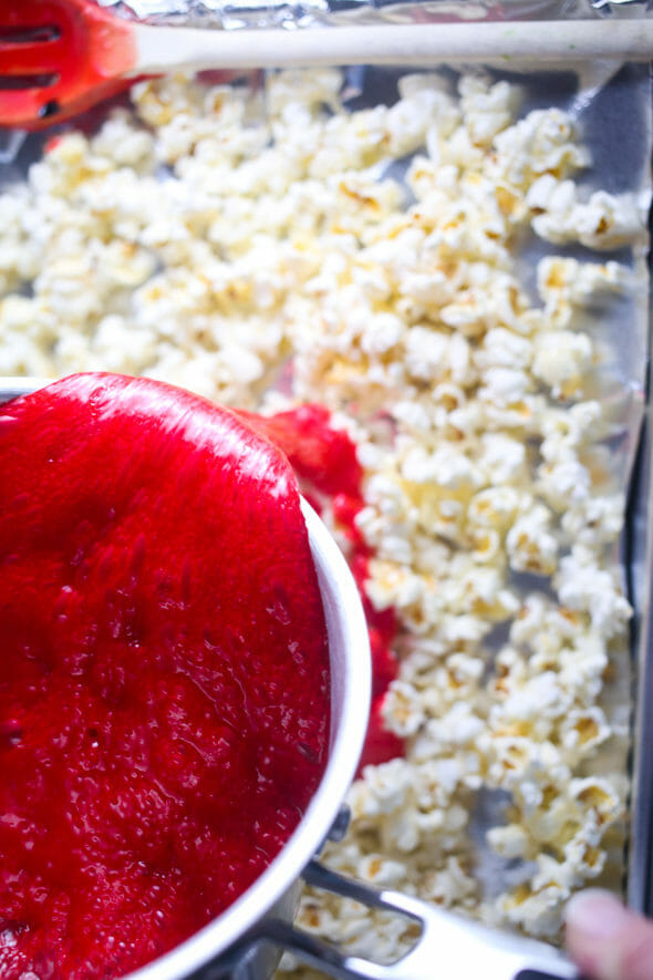 - Pour candy mixture over popcorn and stir to coat evenly.