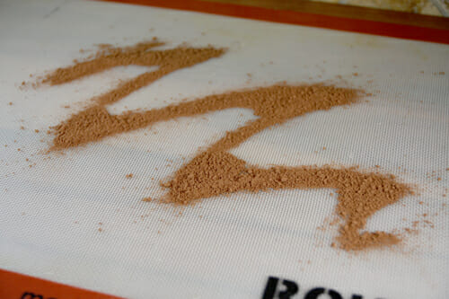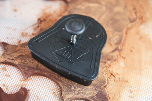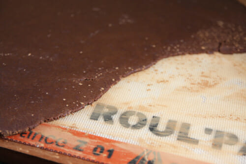 When I do chocolate cookies, I use cocoa powder to dust my rolling surface. It’s actually better to mix a few spoonfuls with some flour and use a combo of the two. I am using straight cocoa here because basically I was too lazy to walk the 6 feet required to get to my flour jar. For real. I am in love with my Roul’Pat; I use it for rolling out just about everything!