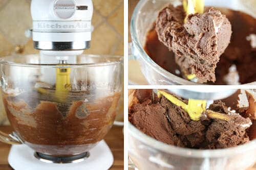 - Whisk flour and cocoa powder together and then slowly add to the butter mixture by spoonfuls with mixer at low speed. Scrape down sides and bottom of bowl as needed.