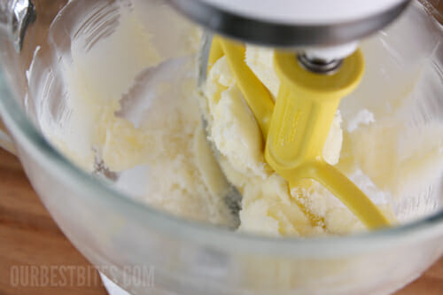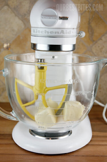 Place butter and sugar in your bowl. I use regular, salted butter and omit the additional salt in this recipe. (Ask me how much I love my glass KitchenAid bowl. So so much.)