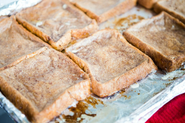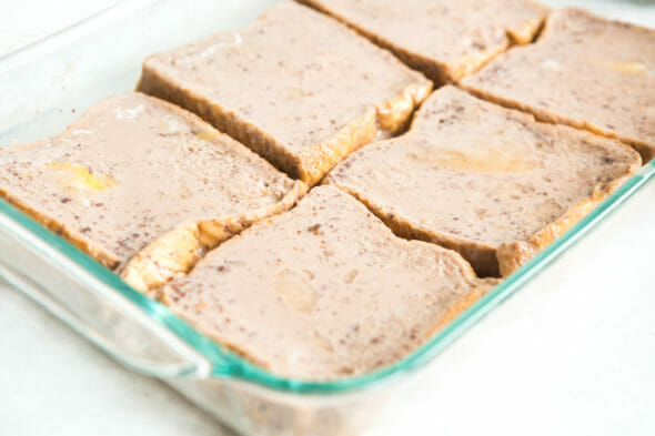 - Lay the slices of Texas toast on the baking sheet and pour the chocolate milk mixture over them. Allow them to soak everything up, flipping after a few minutes so both sides are saturated.