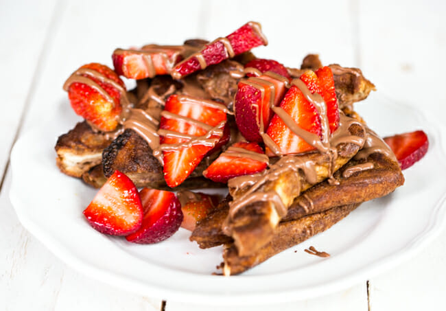 - Heat a little chocolate hazelnut spread in the microwave until it’s smooth and easy to pour. Plate up your French toast, top with strawberries, then drizzle with the melted hazelnut spread and top with sweetened whipped cream.