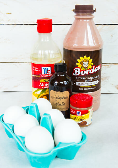 - In a large, glass measuring cup, whisk together the chocolate milk, cocoa powder, cinnamon, eggs, vanilla extract, and almond extract. Lay the slices of bread on another baking sheet (not the foil-lined one you set aside), then pour the mixture over the bread. Allow it to stand for 10-15 minutes or until the bread soaks up the egg/milk mixture (you can carefully flip the bread over if you want to hurry the process along).