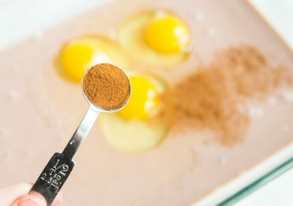 - Start by whisking together some chocolate milk, cocoa powder, cinnamon, eggs, vanilla, and almond extract. Although the pictures show a baking dish, it didn’t end up being large enough so I recommend mixing up the chocolate milk mixture in a mixing bowl and laying the toast out on a baking sheet.