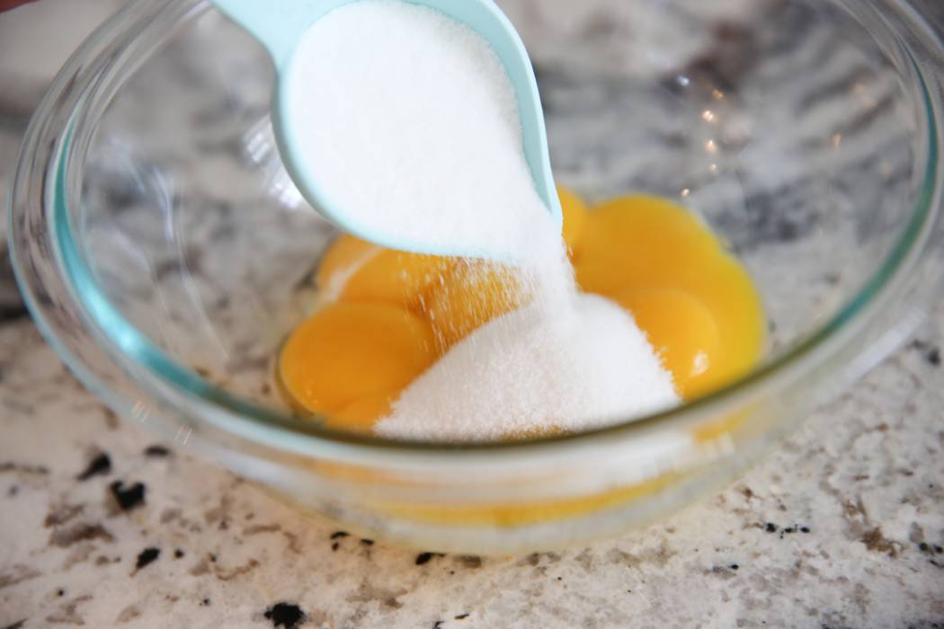 - Place eggs and sugar in a medium-large mixing bowl. Beat with an electric mixer for 3-4 minutes until mixture is pale yellow in color and thick and fluffy.