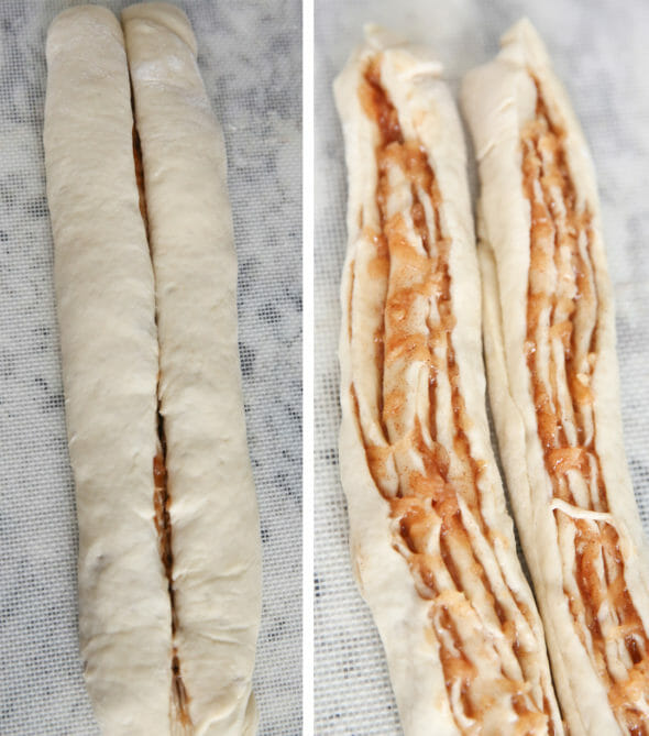 - Starting with a long side, roll the dough into a log, sealing the edge. Use a bench knife, pizza cutter, or sharp knife to cut the log in half lengthwise. Place the half-logs, filled side up, side by side on a well-greased or parchment-lined baking sheet. Keeping the filling side up, twist or “braid” the two logs together, working from the center to each end. Pinch the ends together. Repeat with the second piece of dough. Cover the twists lightly, and set them aside to rise for 1 to 2 hours; they should be puffy but not doubled in bulk. Want to make the bread ahead, then refrigerate overnight and bake the next morning? See “tips,” below.